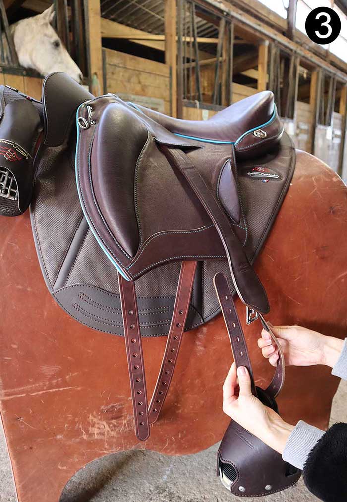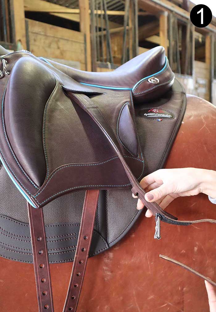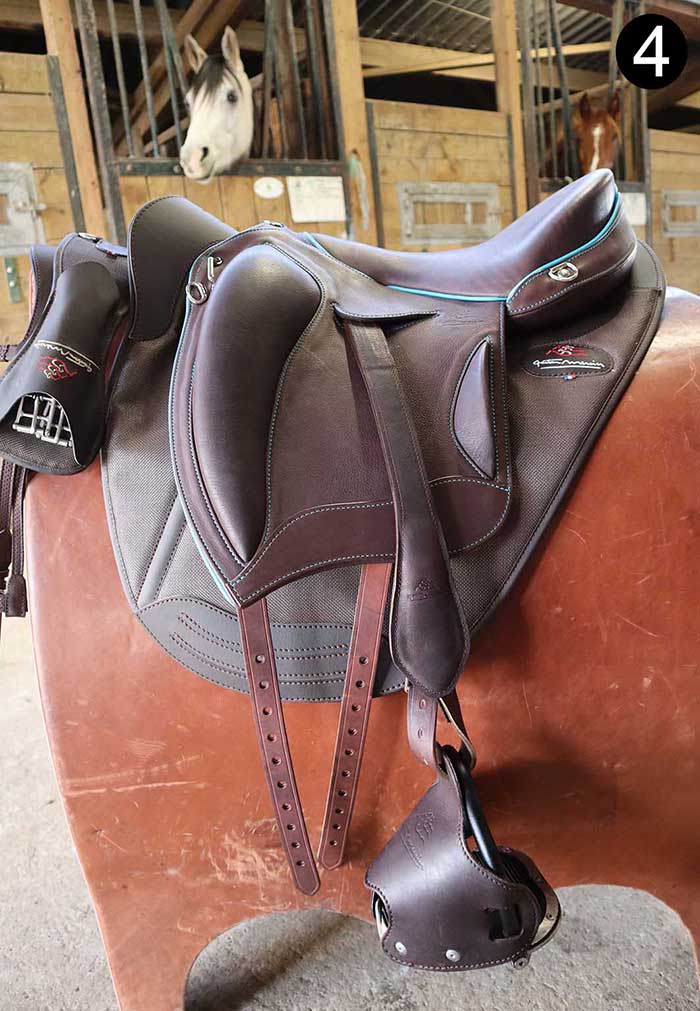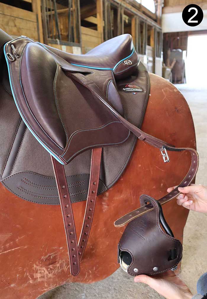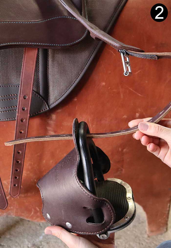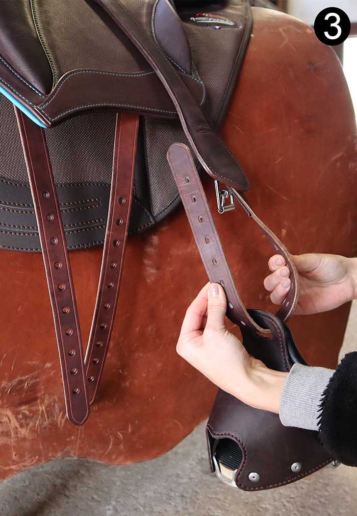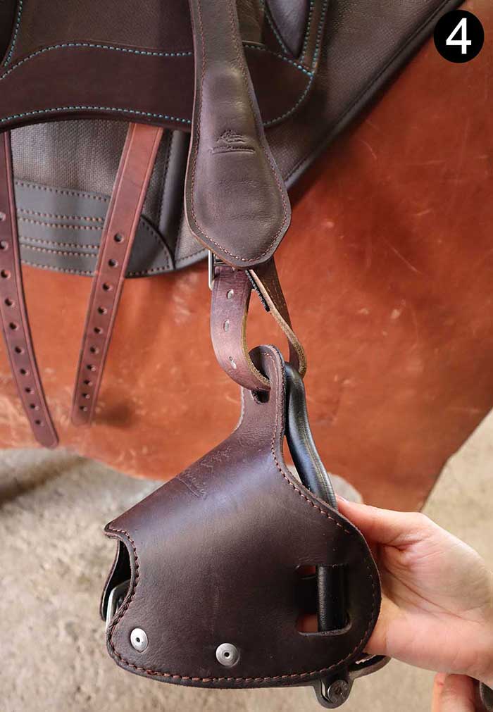 Une simple torsion de cette bride positionne l’étrier naturellement parallèle au cheval et permet de chausser facilement l’étrier.