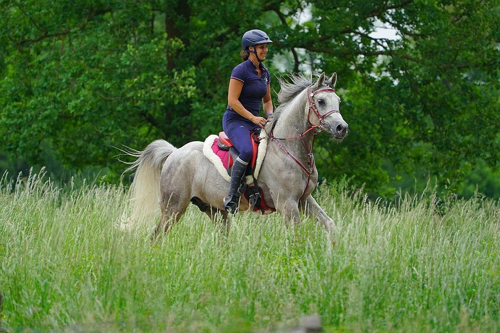 La dernière mais surtout l’une des plus importantes est ma jument de fondation Geraldyne el Jamaal. Après avoir donné naissance à plus de 12 poulains, nous l’avons mise en selle à l’âge de 15 ans. Aujourd’hui, du haut de ses 20 ans, nous concourons au plus haut niveau national en endurance et profitons de nombreuses randonnées en montagne. L’année dernière, elle a parcouru avec succès 178 km en cinq jours à la Schwäbische Alb Distanz. C’était la première compétition que je faisais avec une selle Gaston Mercier et ma jument l’a adorée. De ce fait j’ai à ce jour vendu presque toutes mes selles d’autres marques.